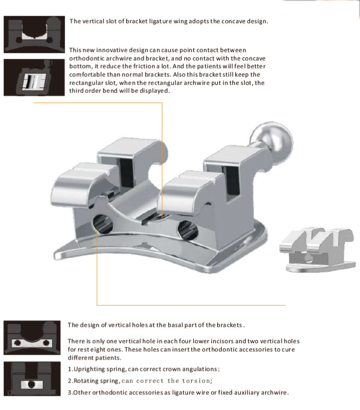 A key innovation of this bracket system is the concave vertical slot design on the ligature wings. Unlike conventional flat-wing designs, this concave structure creates point contact between the orthodontic archwire and the bracket rather than surface contact. By eliminating contact with the concave base, friction between the archwire and bracket is markedly reduced. This allows smoother wire sliding, more efficient force transmission, and improved biological response, while significantly enhancing patient comfort compared to traditional brackets.