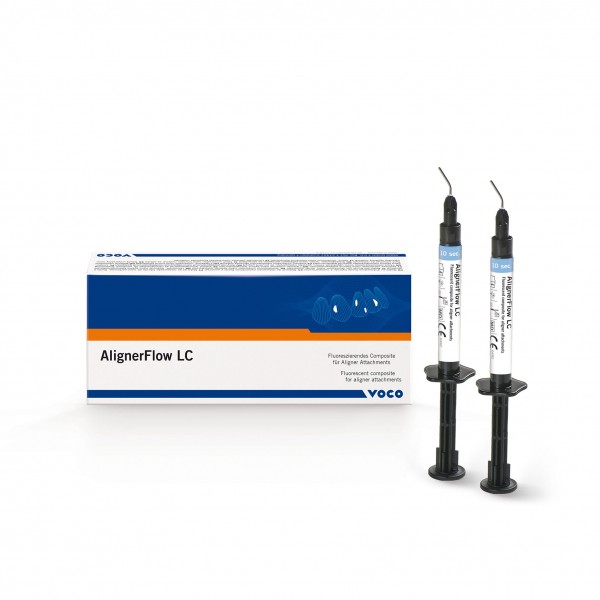 Voco AlignerFlow LC, a Fluorescent, light-cured nano-hybrid flowable composite for precise aligner attachments with high stability and enamel-safe removal under UV-A light.