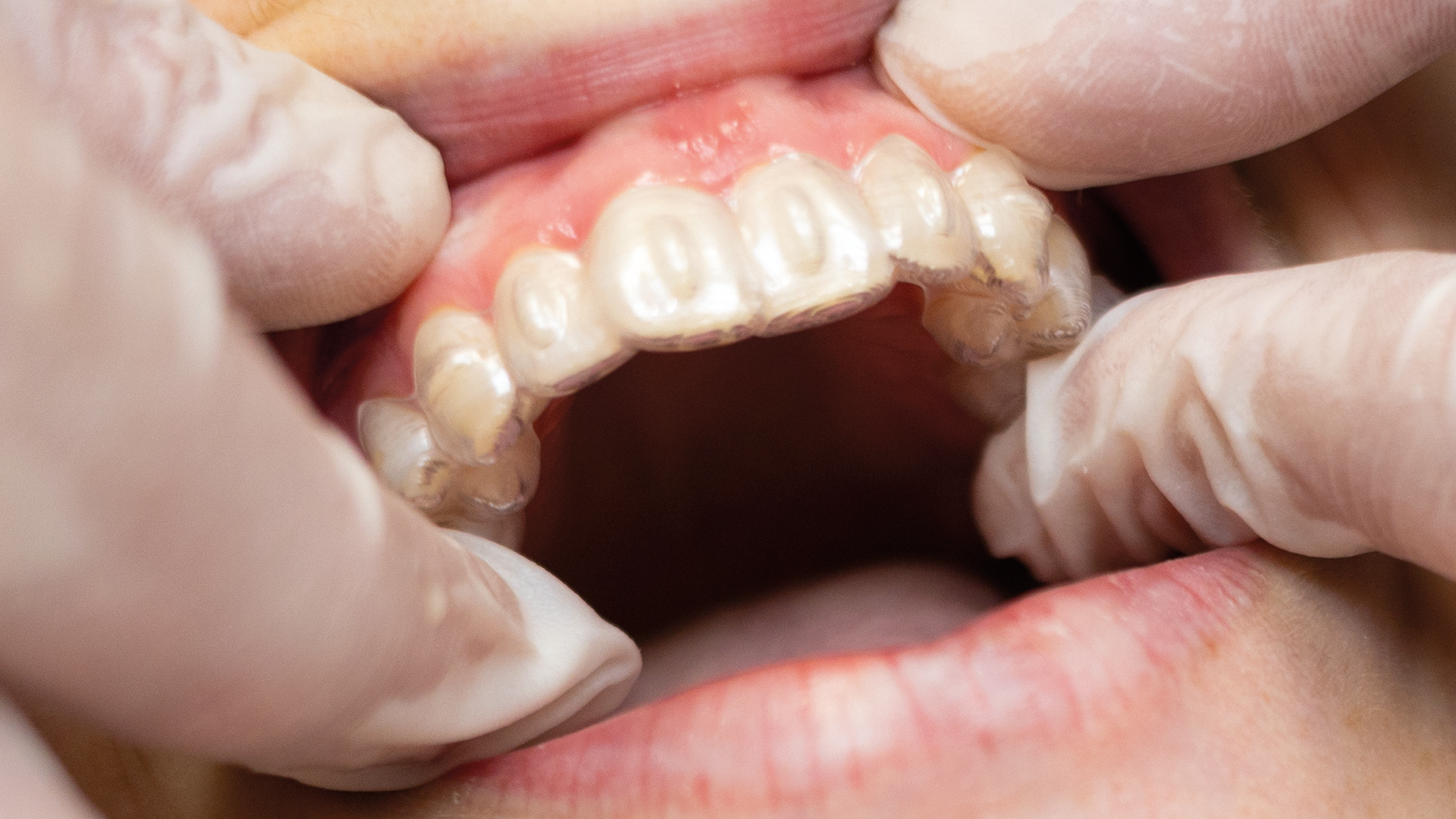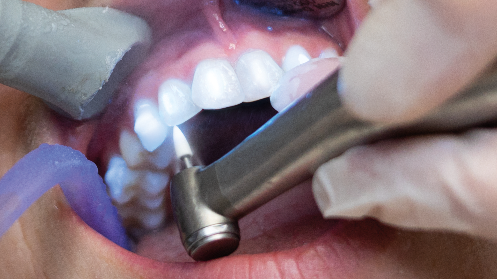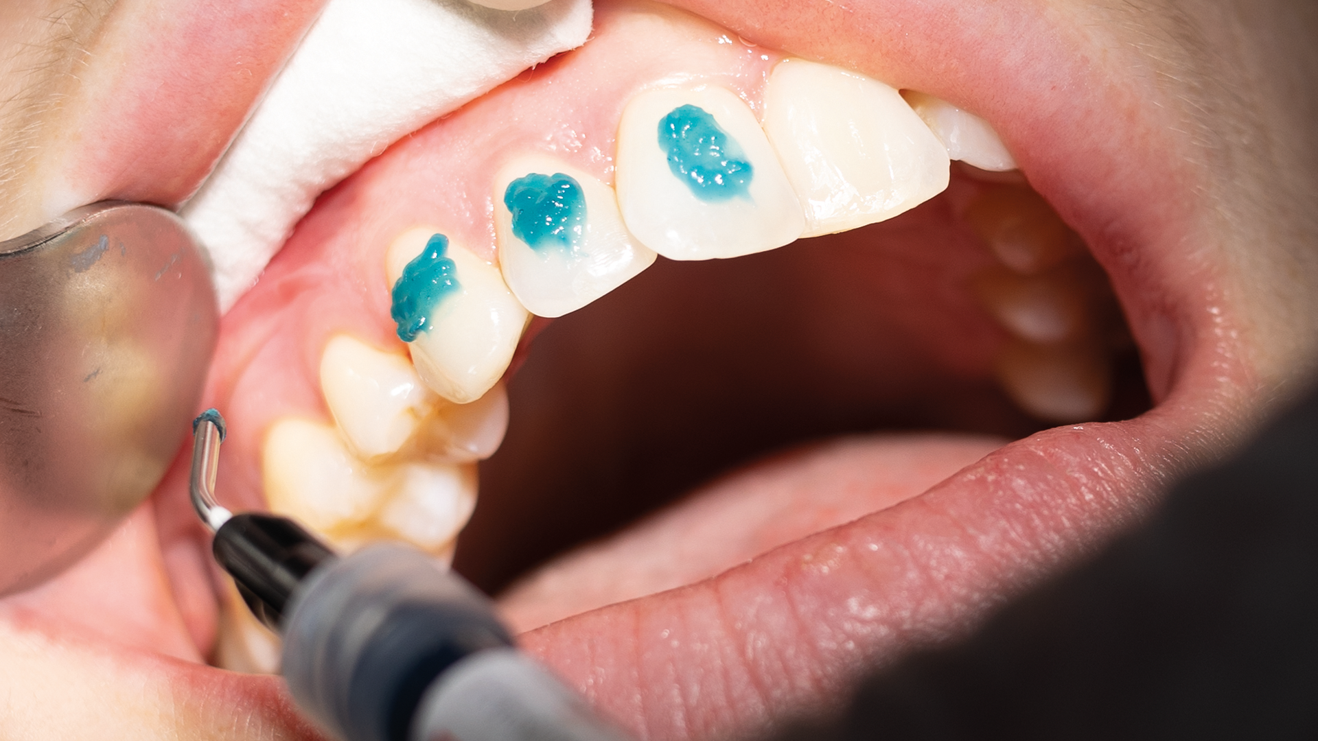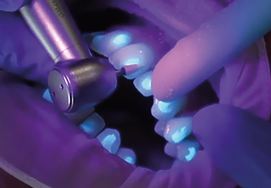 The fluorescent effect enables an exact visual assessment of attachments and residual composite.