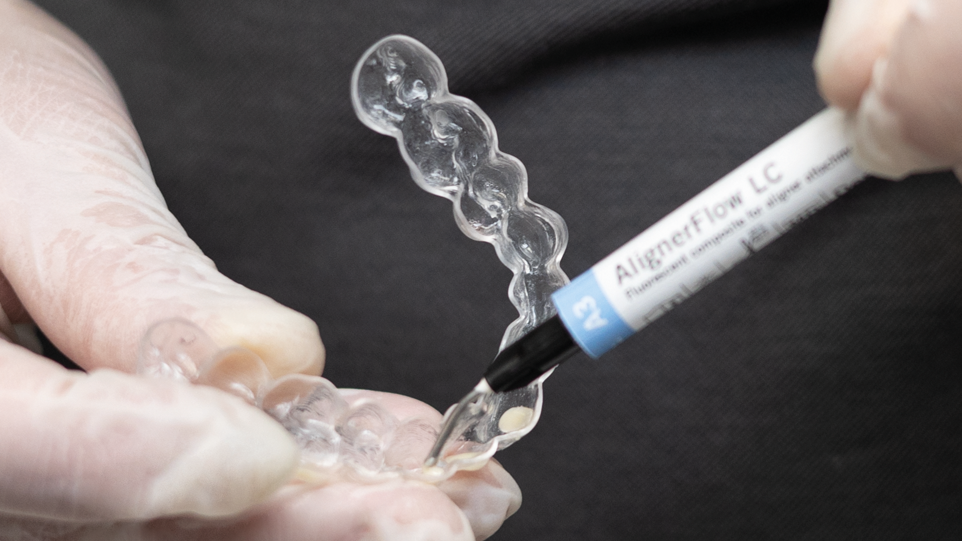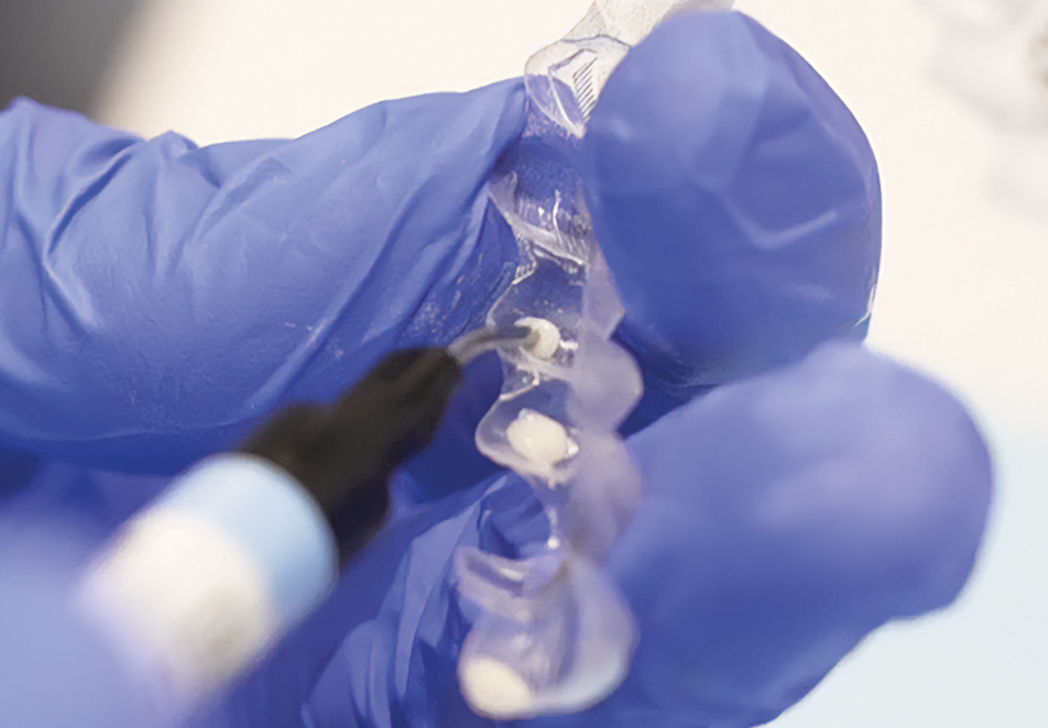 Dispense AlignerFlow LC directly into the attachment concavities of the transparent aligner template.