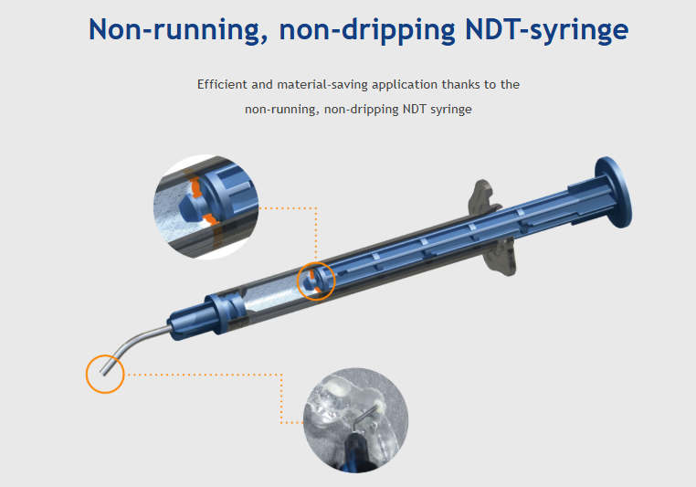 Voco AlignerFlow LC: The enclosed cannulas (diameter 0.9 mm and 1.2 mm) are suitable for direct application into the template splint, for the finest attachments as well as large-area lingual retainers or occlusal abutments in the injection technique.